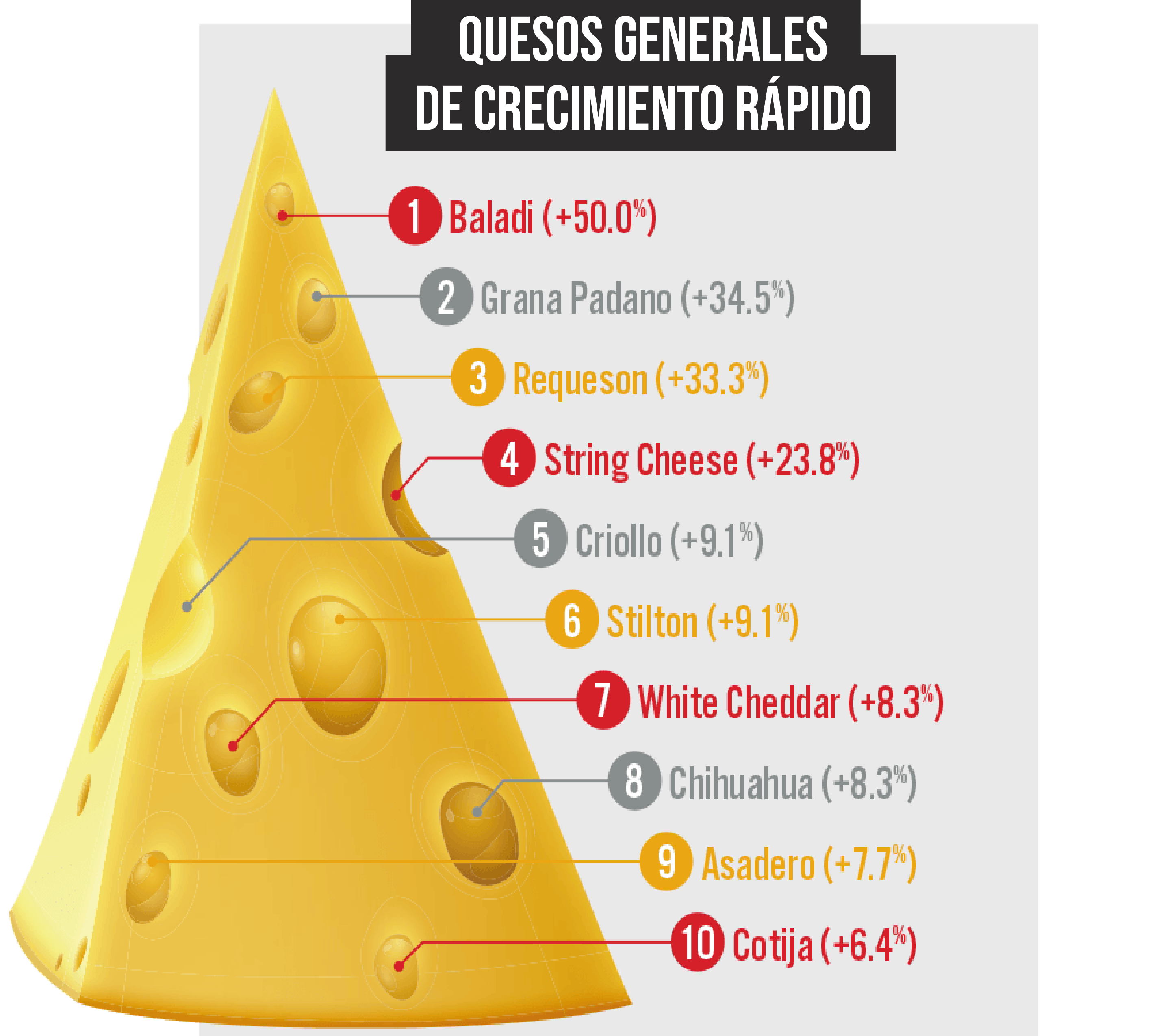 La mayoría de los quesos que muestran mayor crecimiento año tras año tienen un pedigrí global. El queso asadero, cotija, criollo, el requesón y el chihuahua son todos quesos hispanos. El queso grana padano es de origen italiano, y el queso baladi es de Oriente Medio. Pero California ahora produce muchas de estas variedades. Además, el estado es el principal productor de quesos hispanos, incluyendo variedades como el requesón semidulce (una versión hispana del queso ricotta utilizada en ensaladas, salsas, alimentos cocidos y postres) y el queso asadero (un queso suave listo para comer en sándwiches y que se derrite en platos cocidos).
