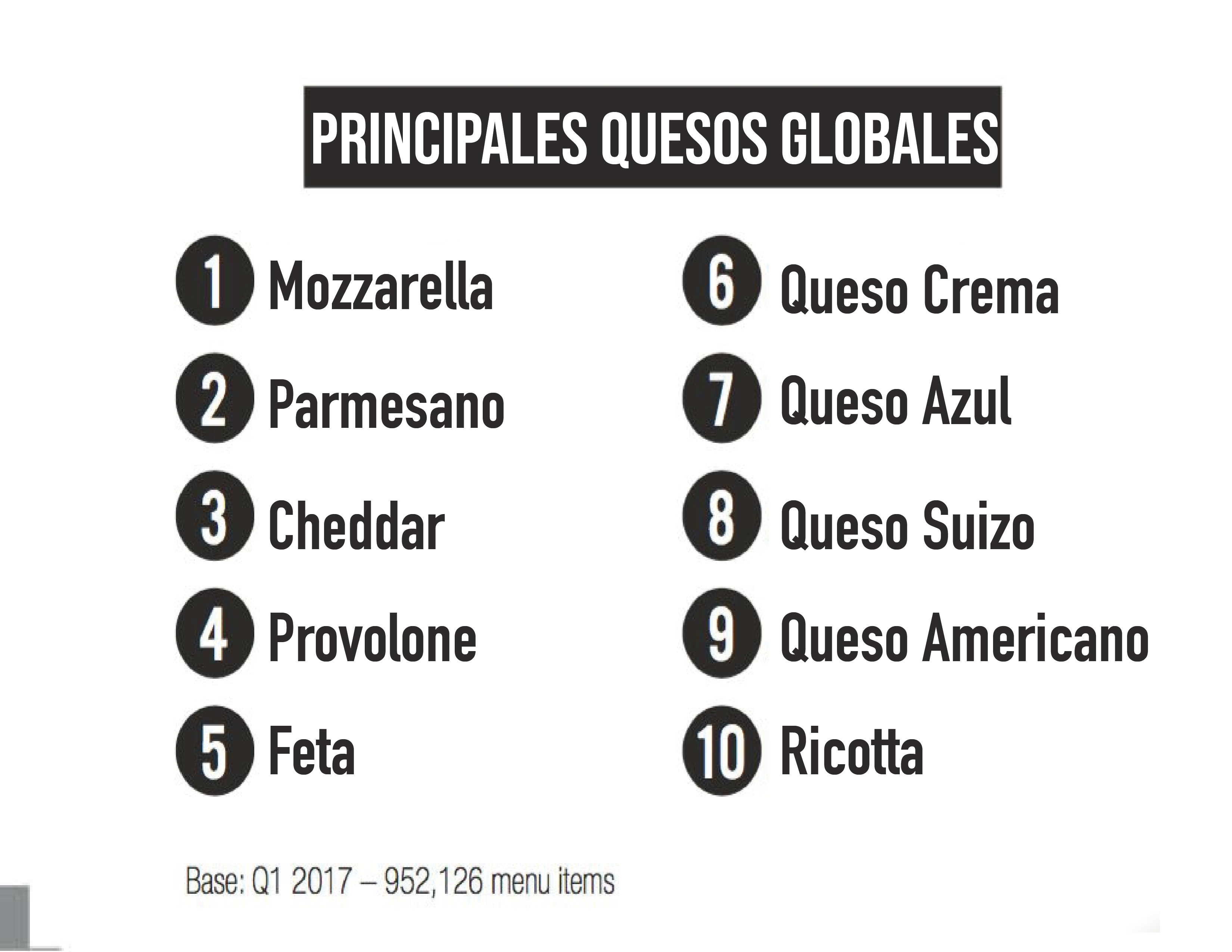 Muchos de los quesos más populares en los menús tienen raíces étnicas. El queso Mozzarella, el parmesano, el provolone y el ricotta son originarios de Italia y el queso feta es originario de Grecia.