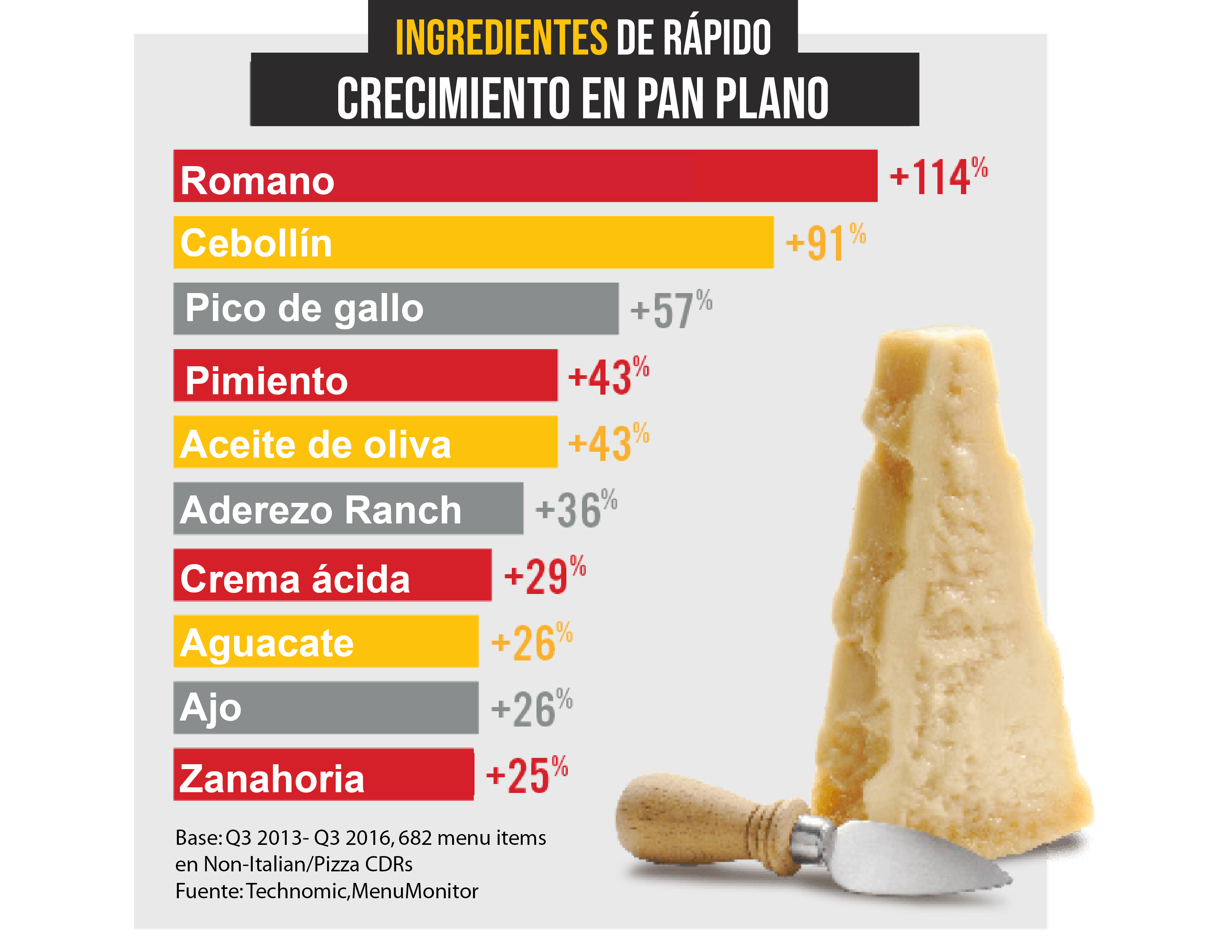 La lista de ingredientes de más rápido crecimiento en panes planos en cadenas de restaurantes no italianos y/o pizzerías muestra que durante los últimos tres años que los restaurantes están tratando de pensar fuera de la caja cuando se trata de panes planos, y dado que la pizza y el queso generalmente van de la mano, no es de extrañar que una serie de productos lácteos están presentes en el top 10. El queso Romano, que encabeza la lista, es un queso italiano firme que es relativamente suave si se hace con leche de vaca, pero más ácido y fuerte si se hace con leche de oveja y cabra. Algunos restaurantes están optando por el queso Romano rallado en lugar de mozzarella estándar sobre panes planos para marcar una diferencia. Otros productos lácteos dentro del top 10 incluyen aderezo ranch y crema agria, que a menudo se agregan en panes planos.